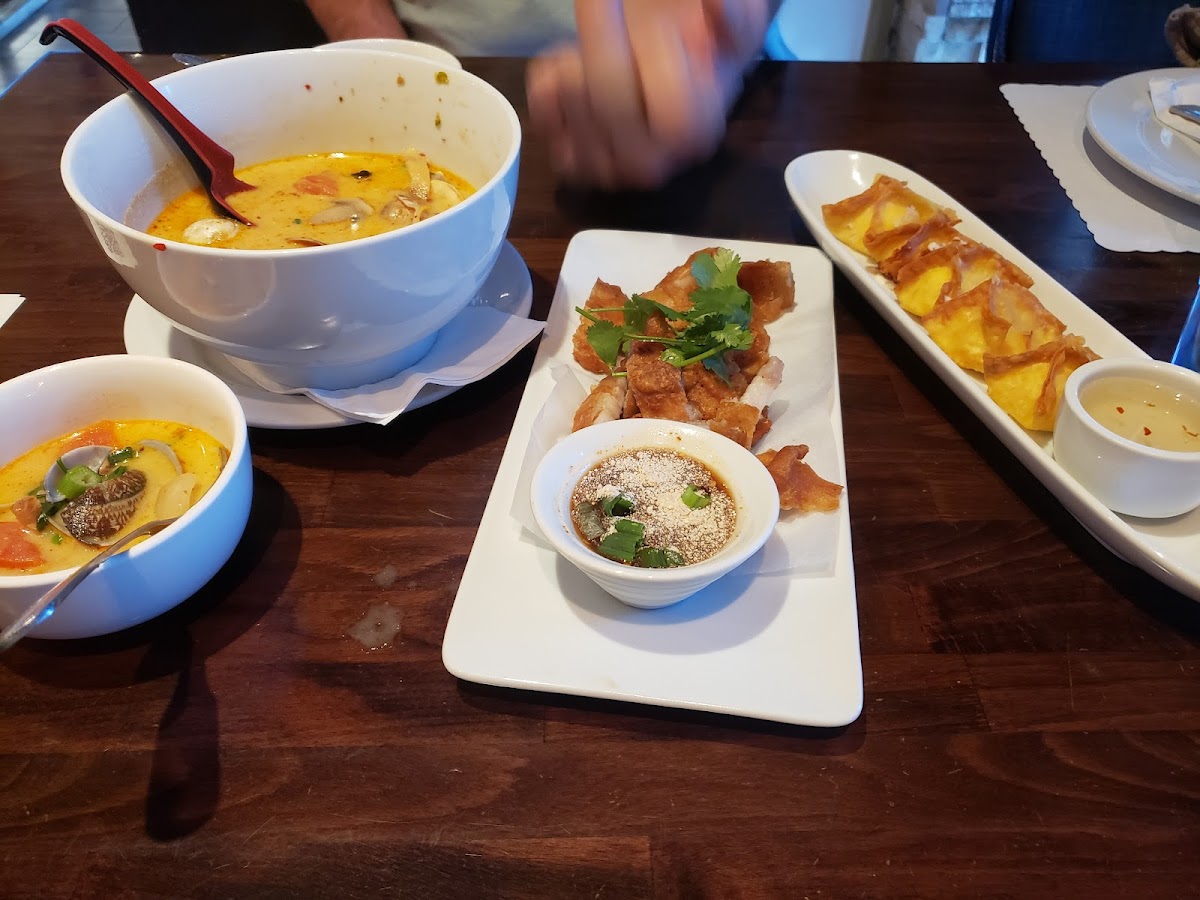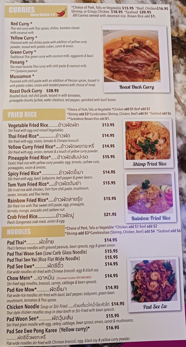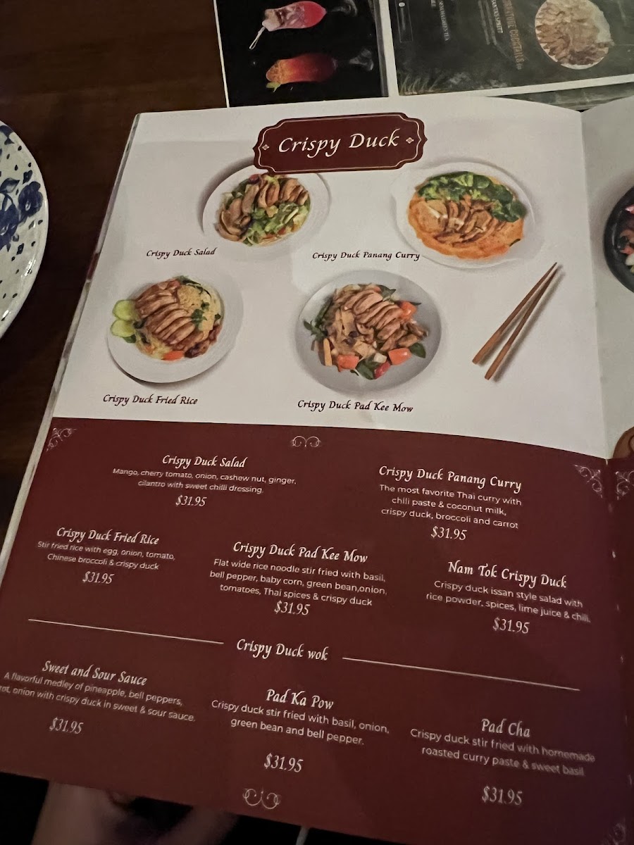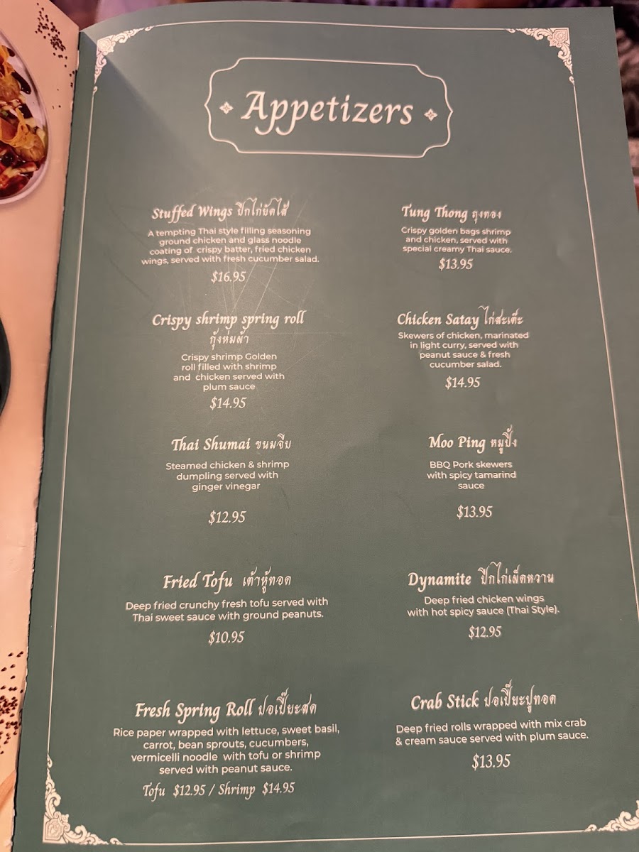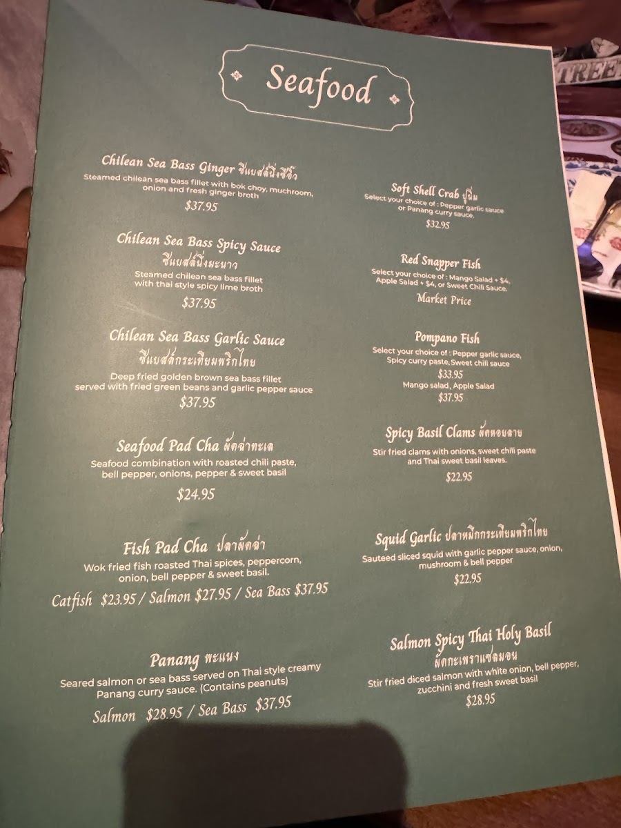 If you're in the mood for street food favorites, the Ka Nom Jeen and Goong Ob Woonsen are must-tries. The Ka Nom Jeen features fresh rice noodles, while the Goong Ob Woonsen offers tender shrimp and glass noodles cooked in a gingery, peppery soy sauce that pairs beautifully with our homemade seafood sauce — both priced at $26.95. These dishes encapsulate the essence of Thai street food, bringing comfort and a burst of delicious flavors to your table.